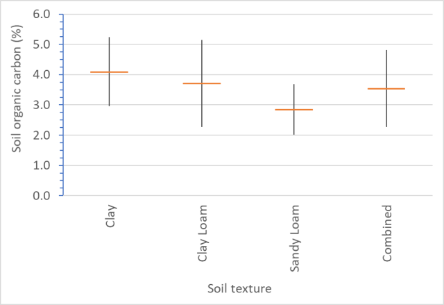 Figure 1: Average soil organic carbon percent (horizontal line) for different soil textures with ± one standard deviation (vertical line) reflecting 68% of the samples. Soil test depth 0-10cm.